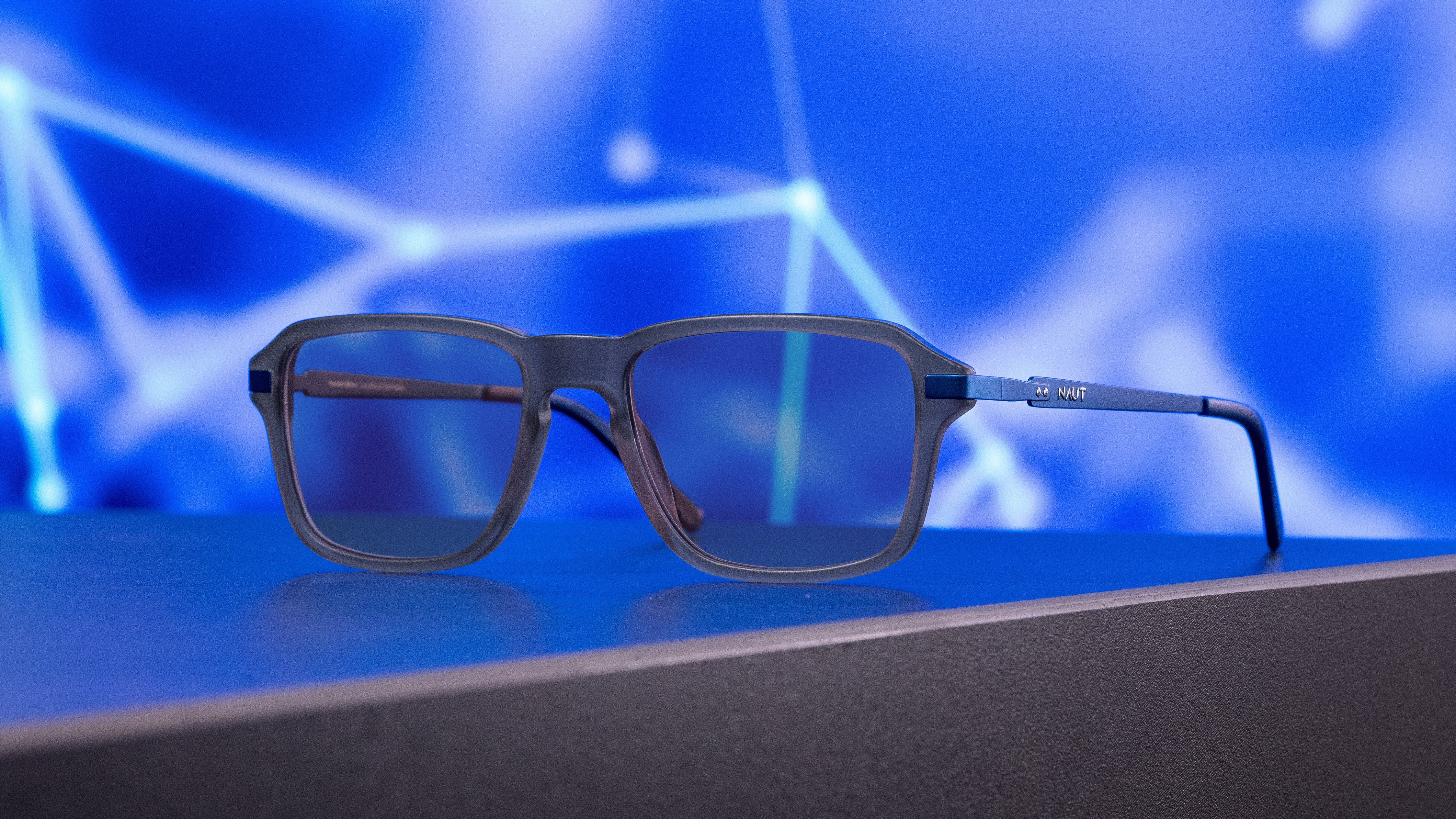 Varillas metálicas azules muy finas con el relieve del logo de NAUT.